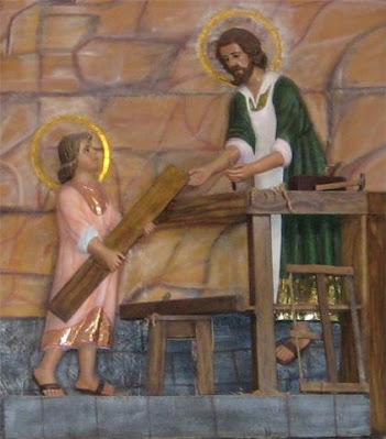 SAN JOSÉ, CÓMO BUEN PADRE, ENSEÑA A SU HIJO JESÚS EL OFICIO DE CARPINTERO.